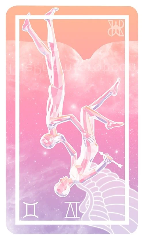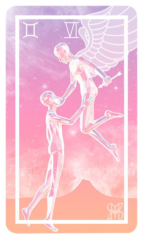 The grounded figure represents the masculine principle and the conscious mind. The figure above represents the feminine principle and the subconscious. The wings on the figure above represent divinity. With their hand on the other’s cheek, they tilt their gaze upward towards the heavens. This illustrates the conscious mind passing through the subconscious to transcend to a place of enlightenment, or the super-conscious. She looks down to meet the lower figure’s gaze and descends towards material temptation. They are connected physically through touch and mentally/spiritually through their gaze. The arrow is a symbol of Sagittarius, which is the star sign that rules over Temperance—a card closely linked to this one. It is also emblematic of Cupid, the god of desire. The dormant volcano in the distance is symbolic of untapped passion and inevitable destruction. Strong partnerships are delicate and require balance.